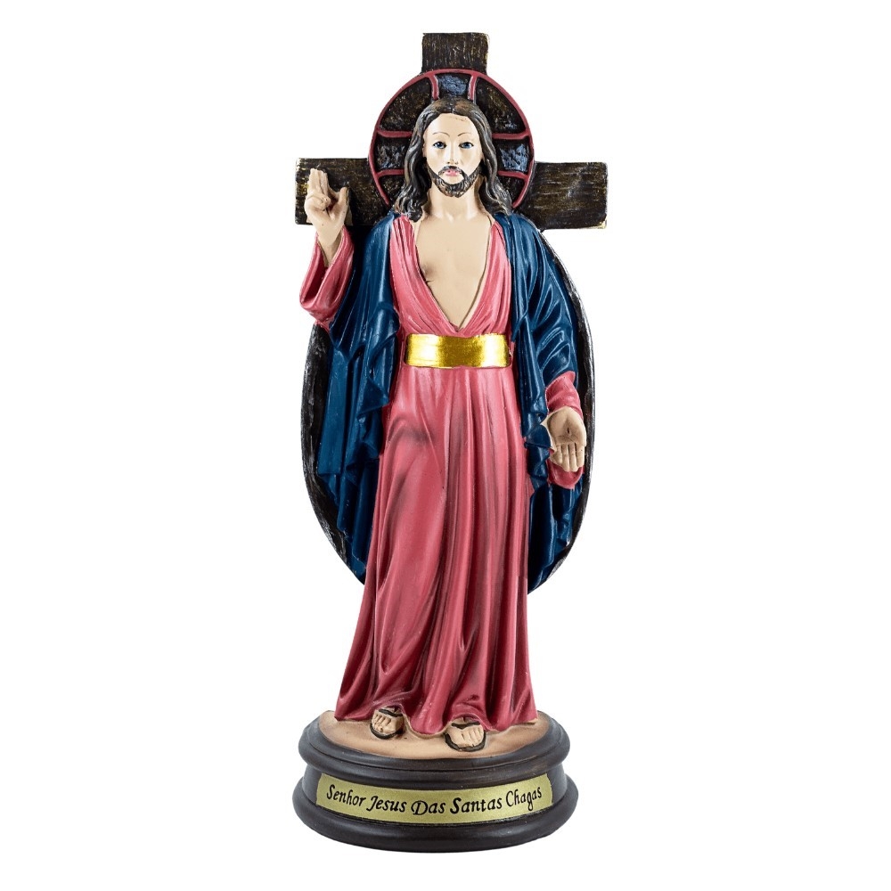A imagem de Jesus das Santas Chagas é confeccionada em resina, possui 22 cm de altura e é toda pintada artesanalmente à mão. Desenvolvida para você, devoto à Jesus das Santas Chagas, fazer uma experiência de oração e expressar sua fé.